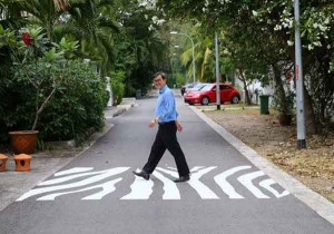 Why would someone take the risk and use stickers to create an unusual zebra crossing on a public road?